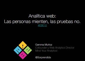 Para todos los que no tuvimos la oportunidad de asistir al EBE 2012, aquí tenemos la interesantísima presentación que hizo Gemma Muñoz (@sorprendida): “Cómo sacar el máximo partido a la analítica web de un blog.” Una breve revisión de cómo pasar de recopilar datos a obtener conocimiento.