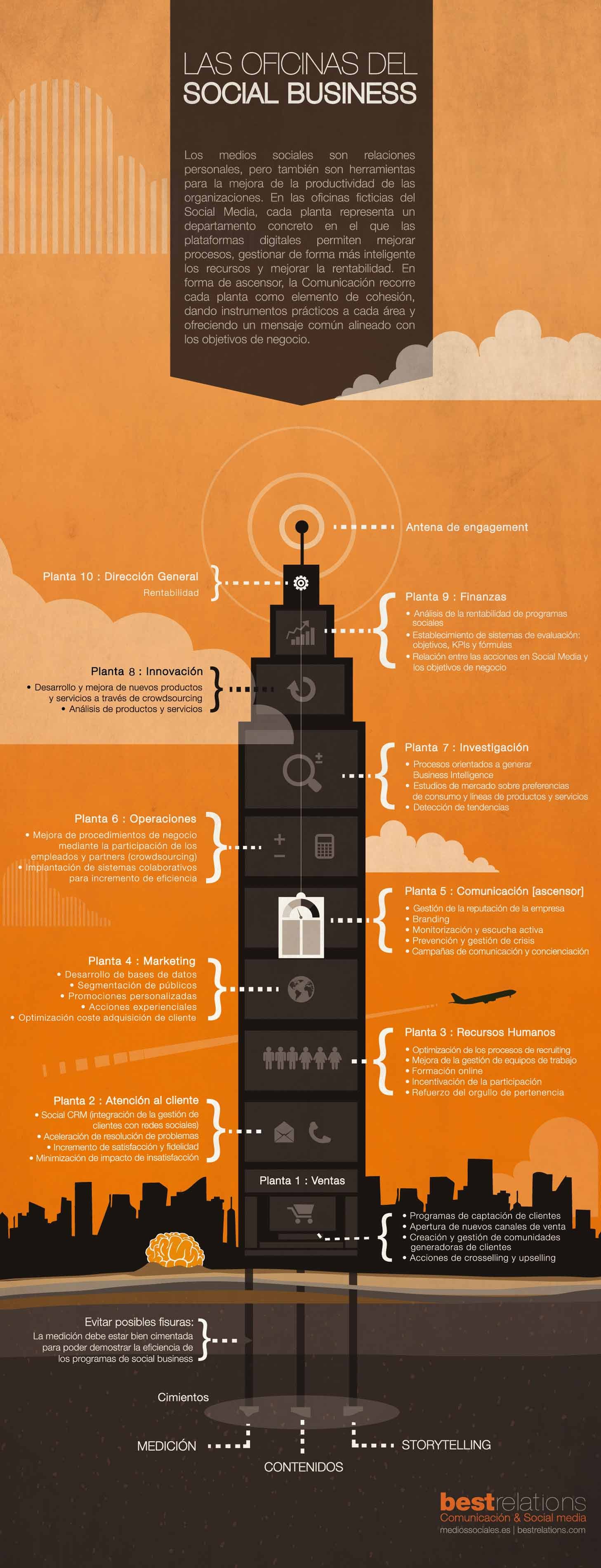 Pera facilitar la comprensión del concepto y de su influencia en cada uno de los departamentos de la empresa, los chicos de Best Relations han creado esta útil infografía “Las oficinas del Social Business”.