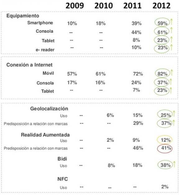 La presencia y uso de dispositivos como el smartphone y la tablet se incrementa, la conexión a Internet se generaliza y se intensifica, al igual que la adopción y uso de diferentes formatos como los códigos QR, email marketing o la geolocalización.