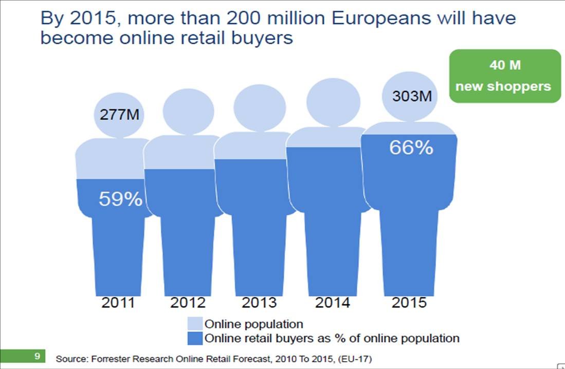 - Los europeos cada vez compran más online. Para 2015, más de 200 millones de europeos comprarán online, lo que supone 40 millones de compradores más que en 2011.