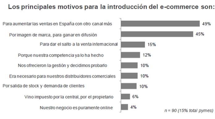 - Los principales motivos que aducen para la utilización del e-commerce son: Aumentar ventas en España con otro canal más (49%), por imagen de marca (45%) o para acceder a mercados fuera de España (15%).